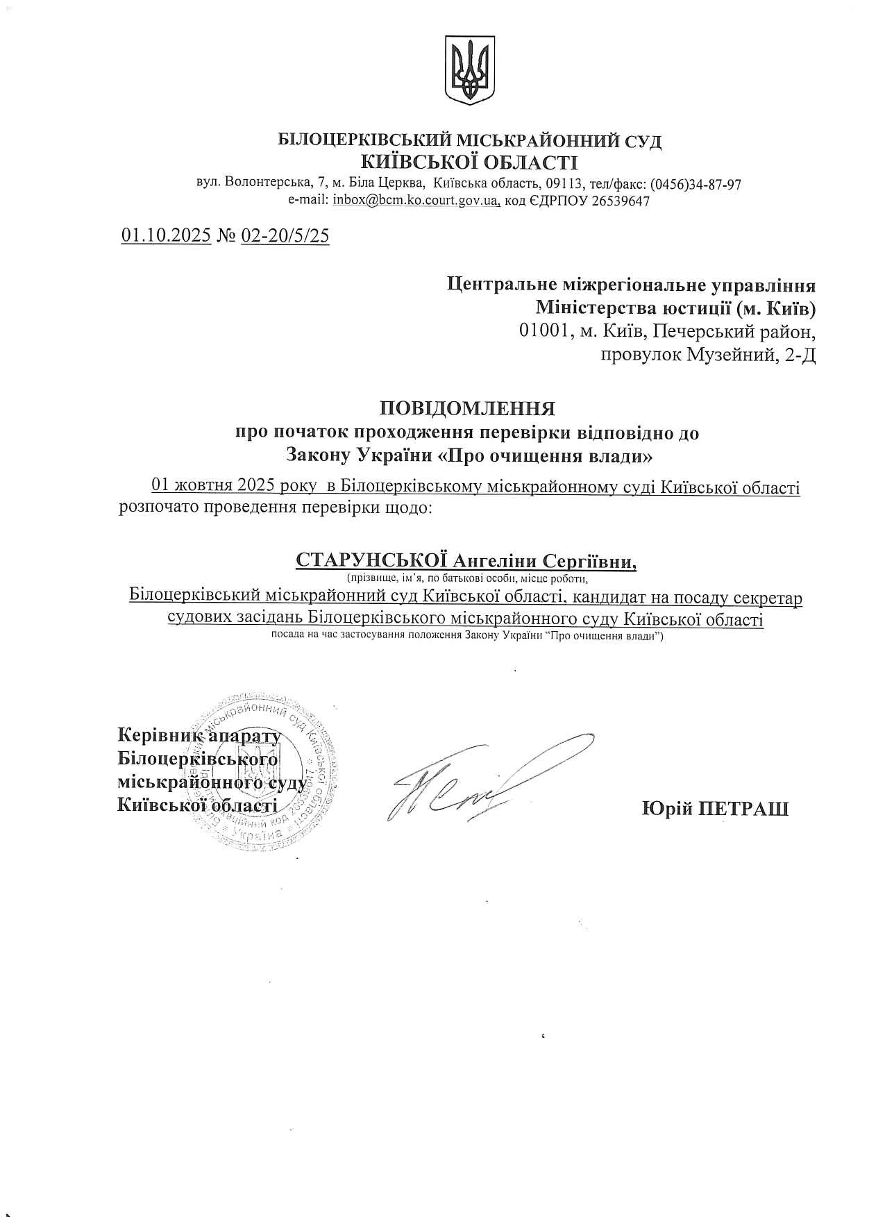 Повідомлення про початок проходження перевірки відповідно до Закону України «Про очищення влади»