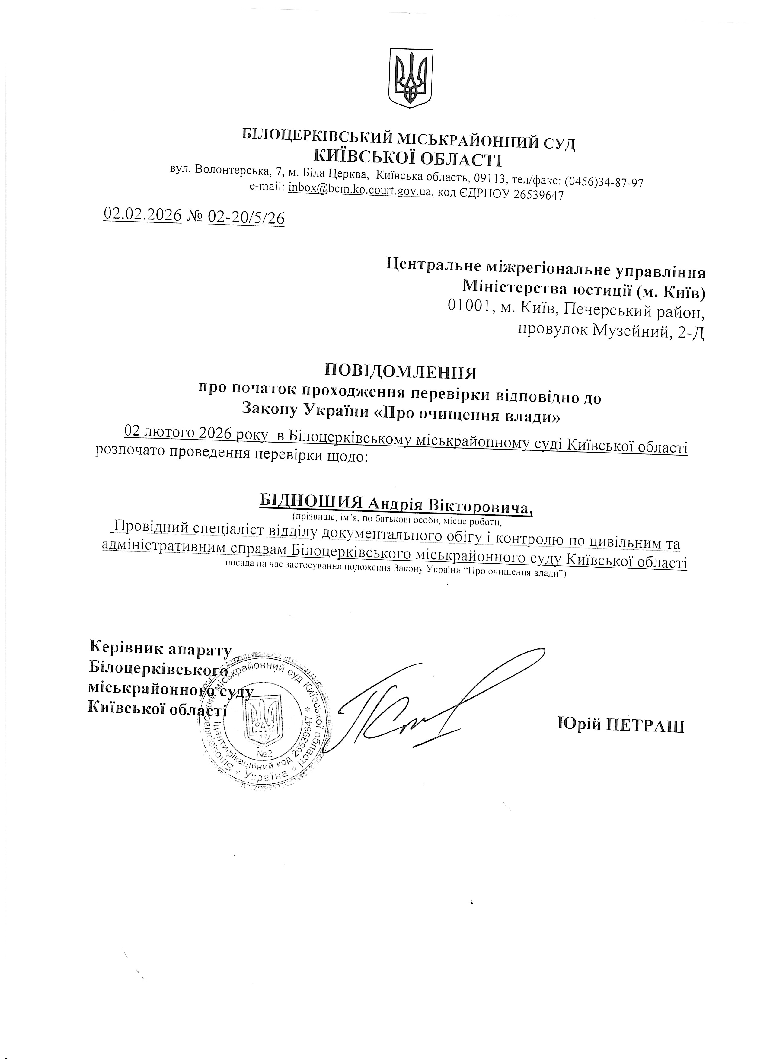 Повідомлення про початок проходження перевірки відповідно до Закону України «Про очищення влади»